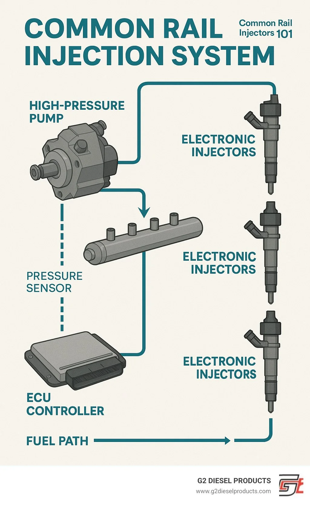 Common rail injectors are electronically-controlled fuel delivery devices used in diesel engines where high-pressure fuel is stored in a shared accumulator (rail) before being precisely injected into the combustion chamber. They represent the most advanced fuel delivery system in modern diesel engines.