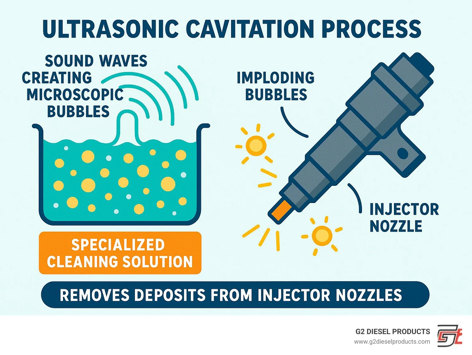 Ultrasonic cavitation creates forces exceeding 10,000 PSI in spaces smaller than a human hair. Those microscopic bubbles implode with incredible violence, literally tearing deposits away from injector surfaces. It's the only method that can reach into the tiniest passages that control spray pattern quality.