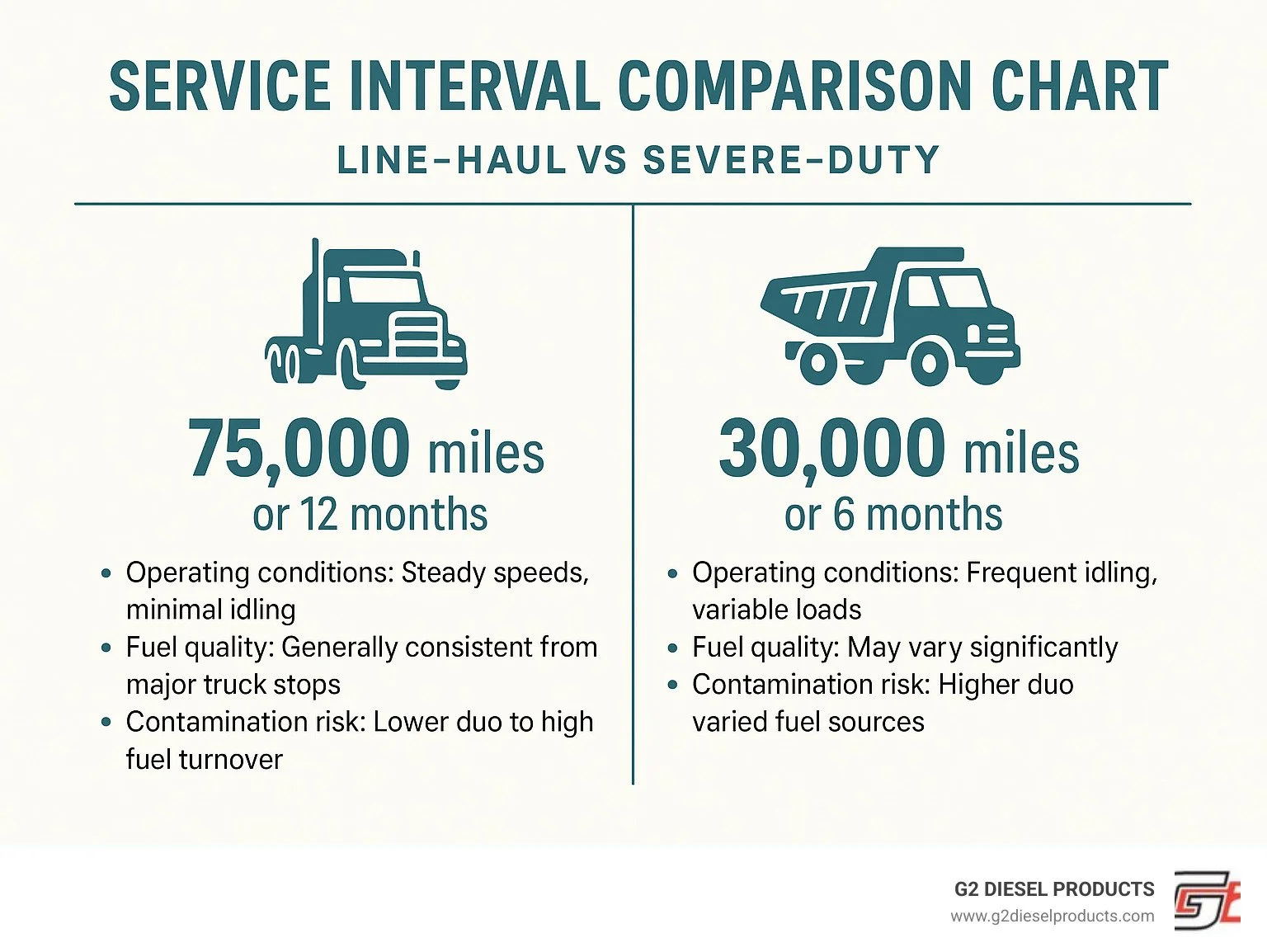 The difference isn't just academic - it's about preventing failures. Severe-duty trucks that try to stretch to highway intervals often face premature filter plugging, water contamination issues, and the expensive repairs that follow.